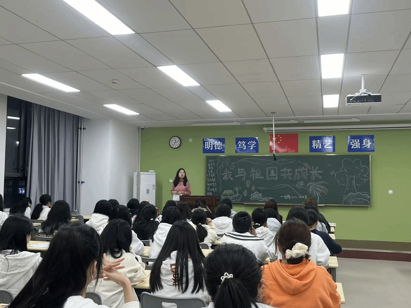 本次主题教育活动以主题班会为主要形式,于周六晚自习时间在全院范围内统一展开。各班级紧密围绕“我和祖国共成长”的主题,策划并实施了内容充实、形式多样的学习活动。班会现场,有的班级组织同学们深情缅怀抗战先烈,回顾那段烽火岁月,感悟革命先辈的崇高精神与坚贞信仰;有的班级开展了生动的抗战历史知识竞答和主题讲述,在互动中加深对历史的理解与认知;有的班级则通过重读抗战家书、分享感人至深的抗战故事,让跨越时空的家国情怀与责任担当浸润学子心田。