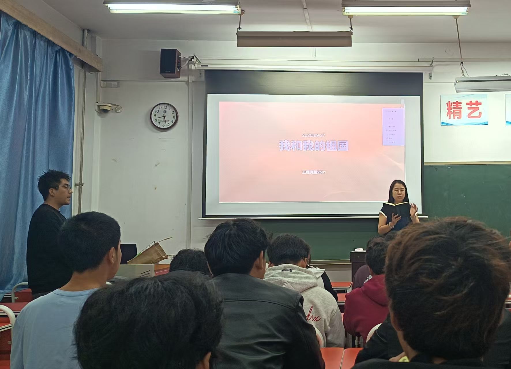 9月27日晚,土木工程学院充分利用晚自习时间,集中策划开展了“我和祖国共成长”主题班会。班会活动主题鲜明、内涵丰富,有的班级组织学生深情缅怀抗战先烈,在肃穆的氛围中追忆烽火岁月,汲取精神力量;有的班级开展党史国情知识竞答和主题讲述,激发学生的知史爱党、知史爱国热情;有的班级通过重读抗战家书、分享抗战故事,让学生在与历史的对话中感受家国情怀与责任担当;还有的班级组织红色经典影片赏析,在光影交错中重温革命先辈的奋斗足迹。一系列活动有效引导青年学生深刻理解了伟大抗战精神的内涵,自觉弘扬革命传统,传承红色基因,坚定了将个人成长融入国家发展伟业的信念。