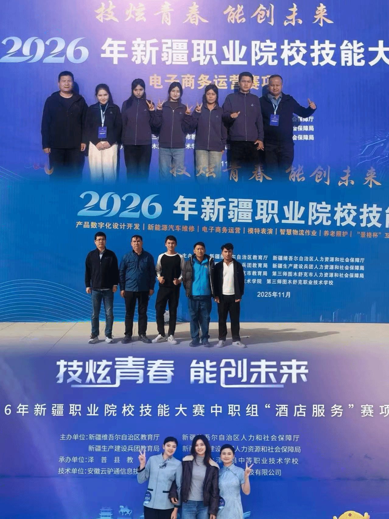 赛场上,在援疆教师团队的精心指导下,墨玉县高级技工学校的参赛师生沉着应战、奋勇争先,展现出扎实的专业素养和良好的精神风貌。其中,李海平老师指导的 “电子商务运营” 赛项表现尤为突出,不仅斩获教师组一等奖,学生组也顺利拿下三等奖,实现了该赛项的双线突破;杨阳老师指导的“新能源汽车维修”赛项同样成果丰硕,教师组与学生组双双荣获三等奖,彰显了该专业的教学成效;范夕萌老师指导的“酒店服务”赛项学生组也不负众望,成功斩获三等奖,用专业技能赢得了评委的认可;特聘老师指导的“养老照护”赛项也取得了三等奖的好成绩。八个赛项的全面参与、多项荣誉的顺利斩获,不仅是对参赛师生辛勤付出的回报,更是我校援疆团队在职业教育帮扶领域取得的又一重要成果。