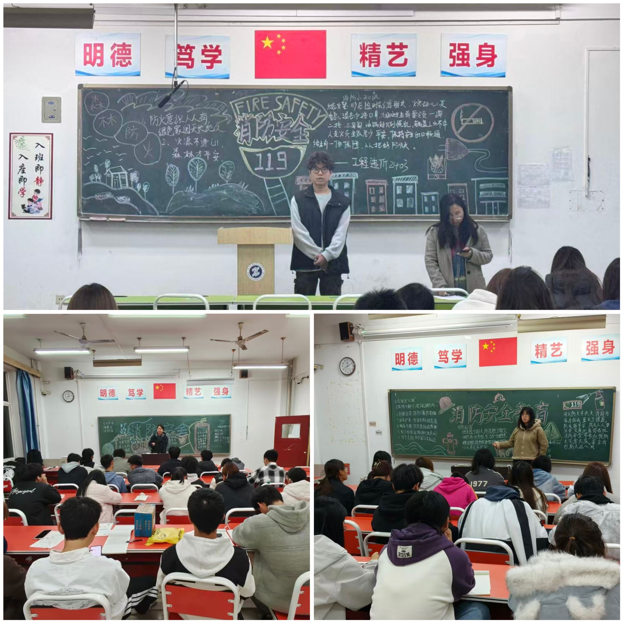 班会伊始,各班观看了消防安全警示教育片,一幕幕因疏忽大意引发的真实火灾现场触目惊心,给在场同学带来了极大的视觉冲击和心灵震撼,通过直观的方式,加深了学生对于消防安全重要性的理解。随后,各班班主任和班长结合近年来发生在高校宿舍的典型火灾案例进行了分析,使同学们明确在宿舍内严禁使用明火、乱拉电线、使用违规电器等具体行为规范。此外,各班还精心设计和制作了消防安全主题板报,板报内容涵盖火灾报警要点、常见灭火器使用方法、火场逃生自救技巧等实用知识,图文并茂,生动形象,方便同学们学习。