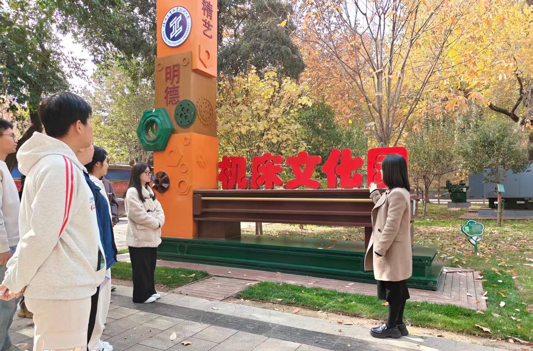 此次活动精心选取了校园内五大文化地标——国学广场·五常柱、陶行知塑像、机床文化园、先进制造技术工程中心及校园操场作为宣讲场地,分别对应阐释“明德、笃学、精艺、强身”的校训内涵。在国学广场·五常柱前,师生共探“明德”要义,融合传统道德与新时代公民素养;在陶行知塑像旁,围绕“笃学”精神,重温教育家思想,探讨求真学问与实干能力;在机床文化园和先进制造技术工程中心,结合“精艺”内涵,阐释工匠精神对建设现代化产业体系的意义;最后在校园操场上,畅谈“强身”价值,强调健康体魄与坚强意志对担当民族复兴大任的重要性。