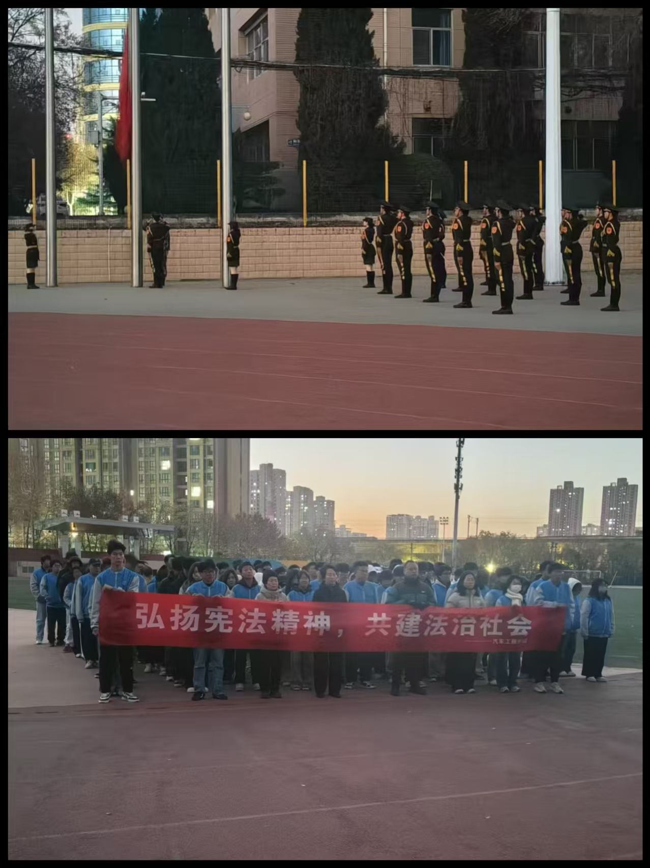 早上6点50分,在激昂的旋律中,国旗护卫队迈着坚定的步伐来到国旗下,五星红旗伴随着《义勇军进行曲》徐徐上升,全体师生面向国旗行注目礼。升旗仪式结束后,学生代表汽制2501班谢长卓作了题为《弘扬宪法精神,共建法治社会》的主题演讲,号召同学们主动学习宪法知识,在校园里争做守法标兵,在社会上争做普法使者,用言行影响家人和朋友,共同建设法治社会。