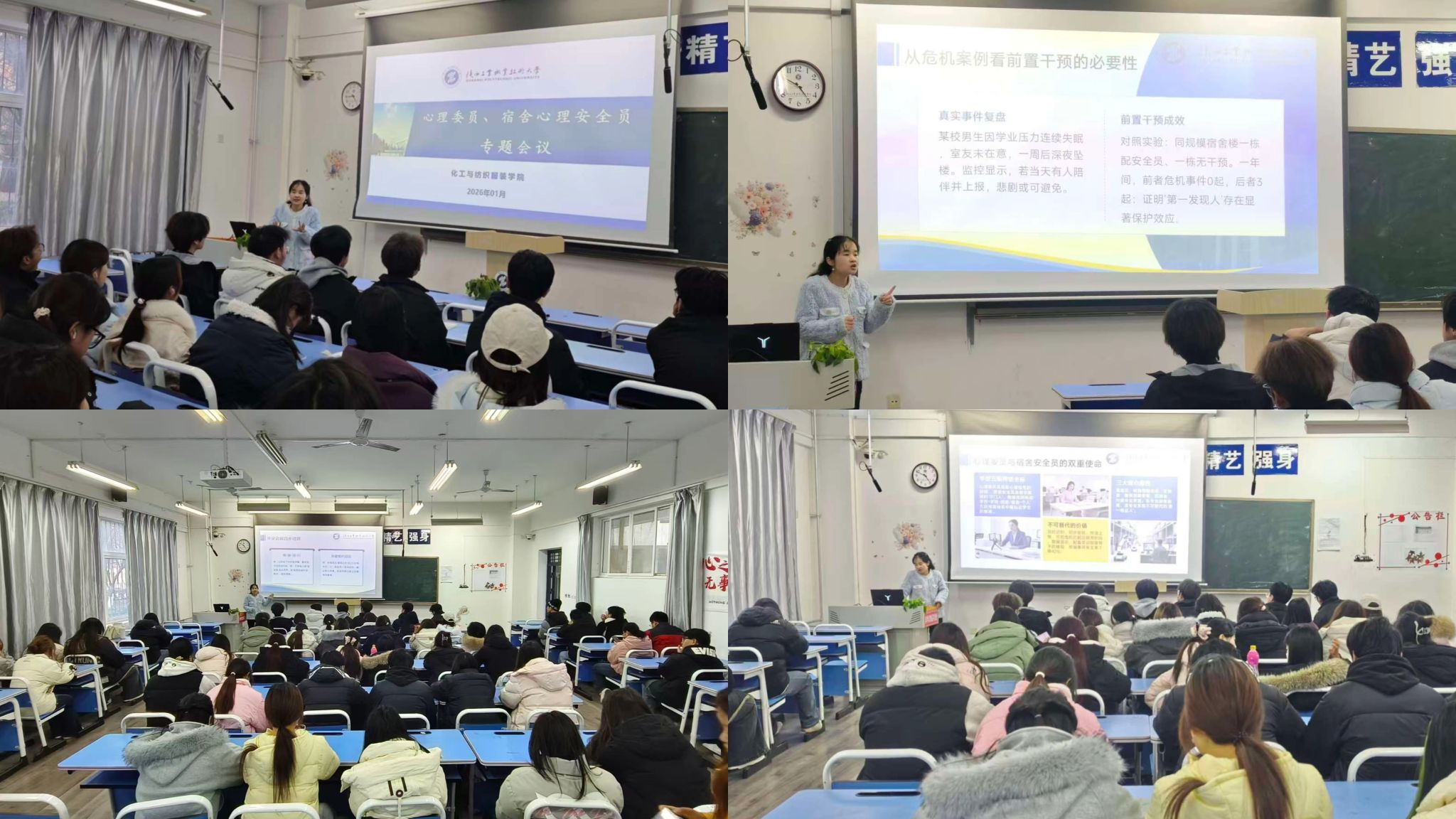 为切实做好期末学生心理健康教育工作,筑牢校园心理防护网络,有效防范心理波动风险,1月8日下午,化工与纺织服装学院在崇文东楼107教室组织召开心理委员与宿舍心理安全员专题培训会。本次培训由学院心理专干闫琼老师主讲,大一、大二各班级心理委员及宿舍心理安全员参加。