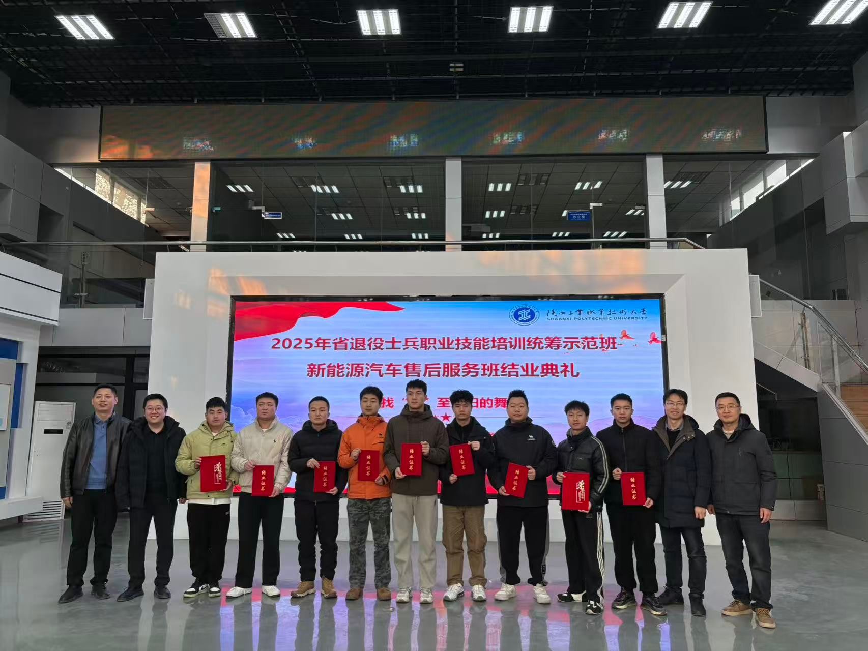 1月23日上午,我校2025年陕西省退役士兵职业技能培训统筹示范班结业典礼在宁德时代动力电池先进制造中心举行。继续教育与培训学院培训管理科科长路程、樊鑫、来阿闯老师,汽车学院实训中心主任苟琦智、夏伟老师及全体参训学员参加典礼,典礼由夏伟老师主持。