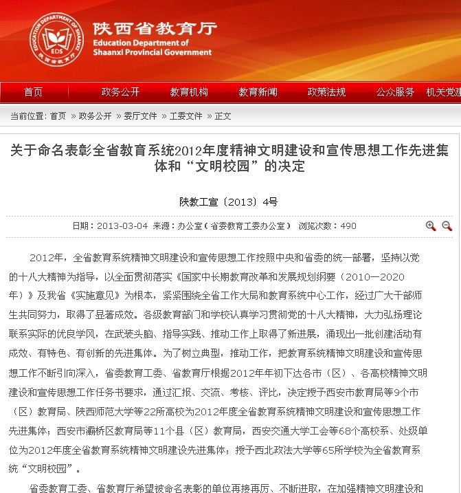 近日,中共陕西省委教育工委、陕西省教育厅命名表彰全省教育系统2012年度精神文明建设和宣传思想工作先进集体,我院被评为“2012年度全省教育系统精神文明建设和宣传思想工作先进集体”,机械工程学院被评为“2012年...