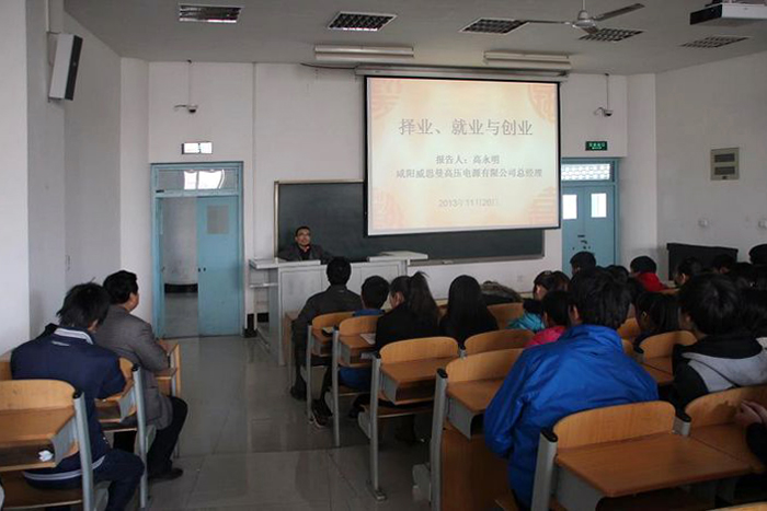 11月26日下午,我院91级优秀校友——咸阳威思曼高压电源有限公司总经理高永明做客企业经理人大讲堂,在祟文西楼203多媒体教室为电气工程学院200余名学生作了“就业择业与创业”的专题报告。