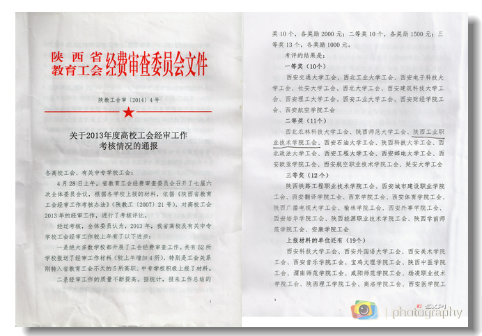 日前,省教育工会通报了工会经审委员会依据《陕西省教育工会经审工作考核办法》对全省59所高校2013年经审工作考评结果,我院工会荣获2013年度陕西省高校工会经审工作二等奖,省教育工会对我院工会经审工作通报表彰。