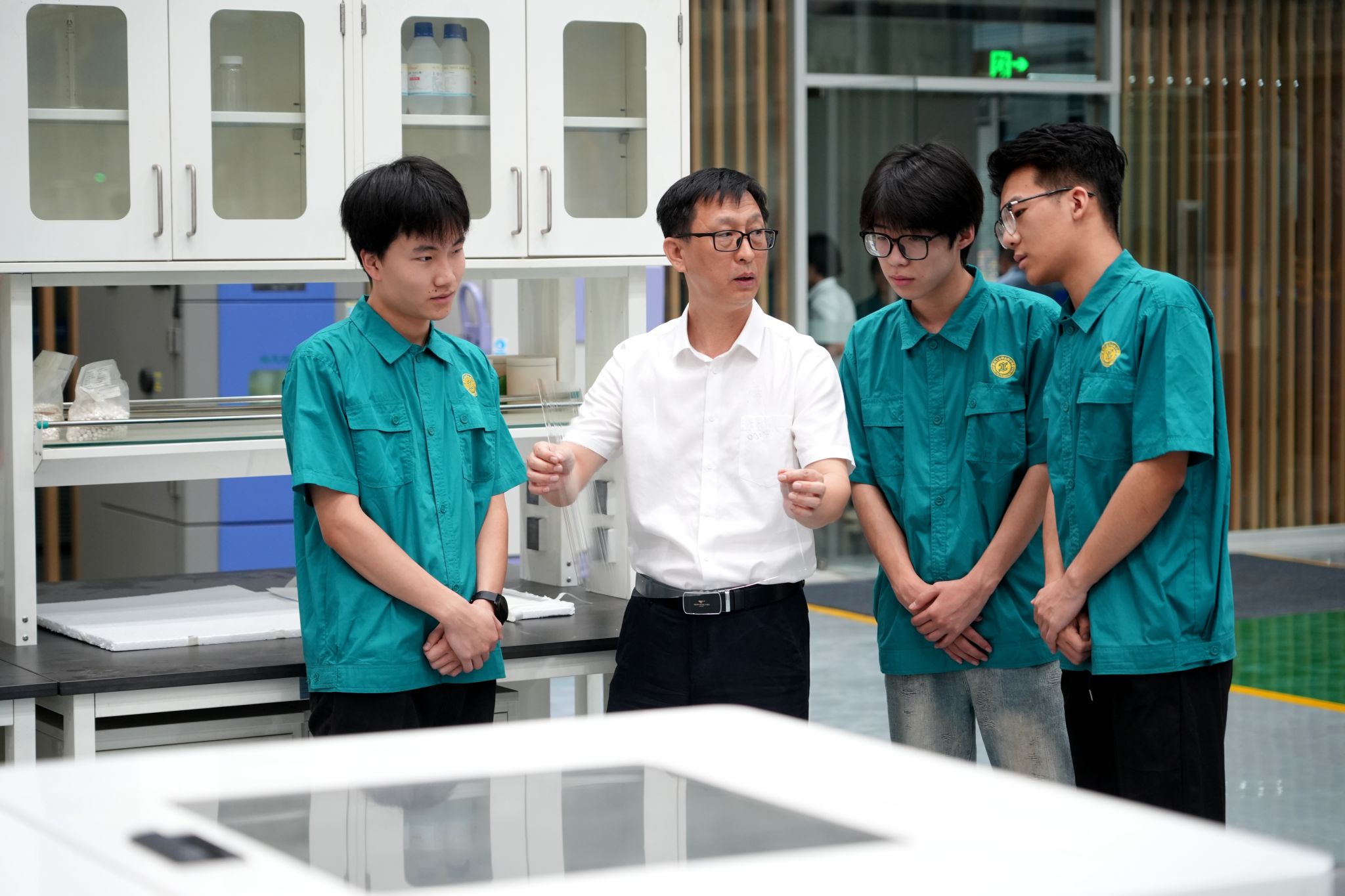 在重点实验室建设阶段,学生参与技术路线研讨、设备开发与性能测试;在中试线搭建过程中,学生投身参数调试、工艺优化与生产运维,全程深度融入科研与产业实践。他鼓励学生将毕业论文与生产线实际难题相结合,围绕柔性玻璃平整度优化、生产线能耗控制、成型工艺改进等关键问题开展研究,研究成果直接反哺项目攻关,实现了“学研用”一体化。