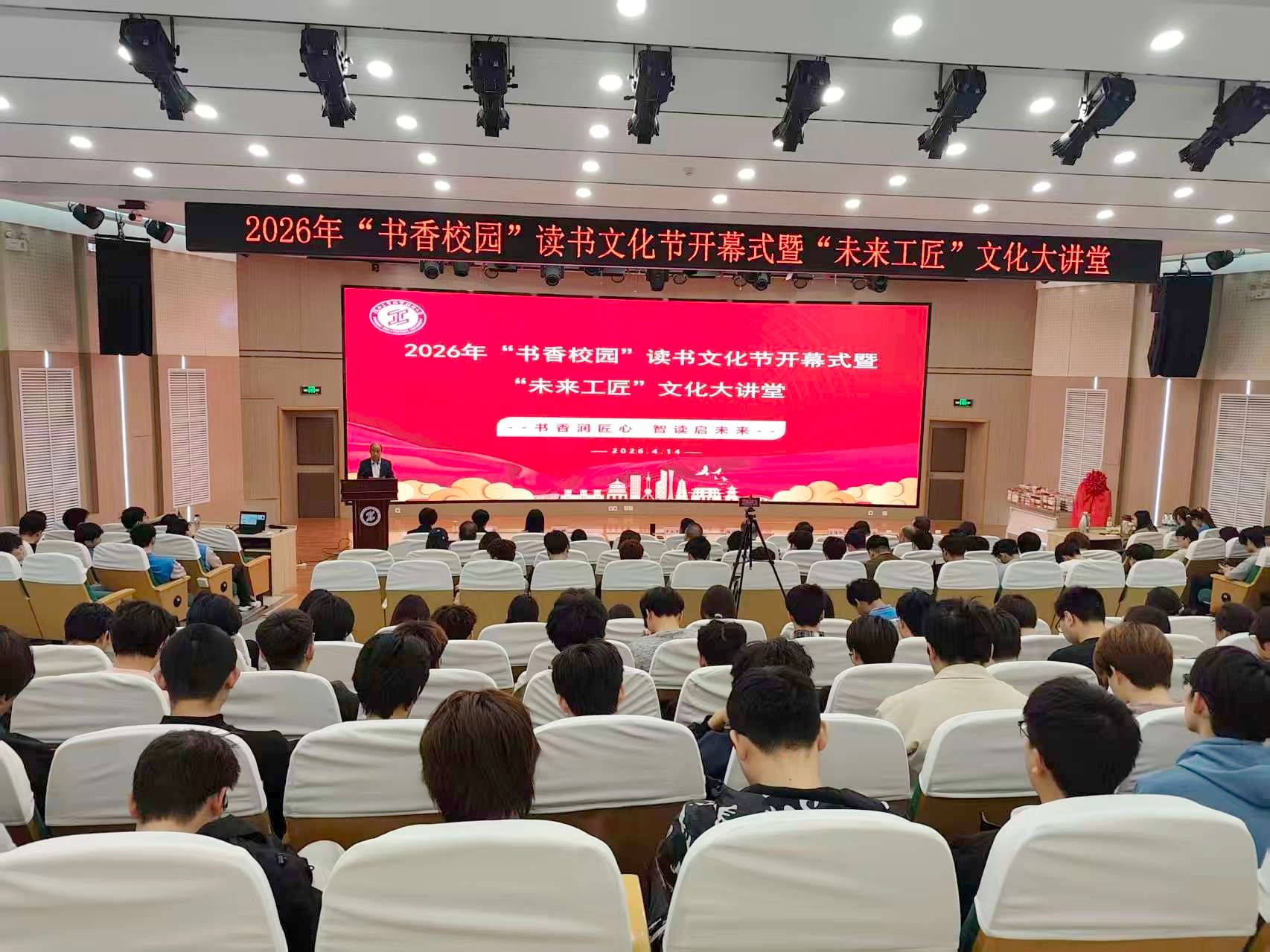 芳菲四月,墨韵书香;薪火赓续,匠心筑梦。4月14日下午,2026年“书香校园”读书文化节开幕式暨“未来工匠”文化大讲堂活动在渭城校区学术会堂举行。副校长梅创社,樊登读书联合创始人王永军,帆书高校推广部负责人韩琳出席活动,开幕式由图书馆馆长王丁主持。