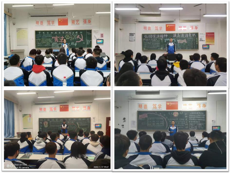 活动前,各班精心策划制作主题黑板报,营造了浓厚的学习氛围。活动期间,各班班长带领本班同学学习了宪法的地位与作用、目的与意义以及国体和政体、国家的领导核心和指导思想等诸多内容。同学们围绕“宪法在身边”展开热烈讨论,有的同学联系个人行为习惯谈到了如何做一名自觉守法的好公民;有的同学结合身边现象发表了对于宪法条文的认识理解;也有同学讲到了尊崇宪法、学习宪法、维护宪法对于个人成长发展的重要性。活动最后,各班主任要求同学们深刻领会宪法精神,在生活中自觉约束自己,做一名自律、守法、懂法的优秀大学生。