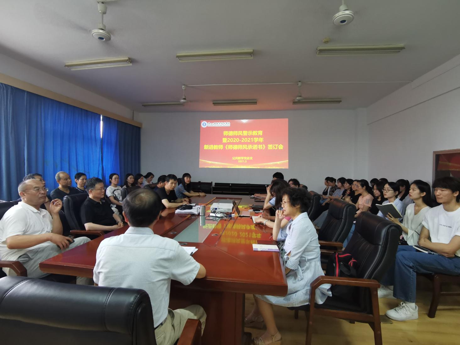 为进一步加强教师职业道德建设,落实教育部关于师德师风教育整顿相关行动,努力建设一支“有理想信念、有道德情操、有扎实学识、有仁爱之心”,适应教育改革发展需要的高素质教师队伍,5月31日下午,公共教学党总支组织开展了师德师风警示教育暨新进教师《师德师风承诺书》签订仪式。公共教学党总支书记、公共课教学部部长南欢主持,公共课教学部全体教师参加活动。