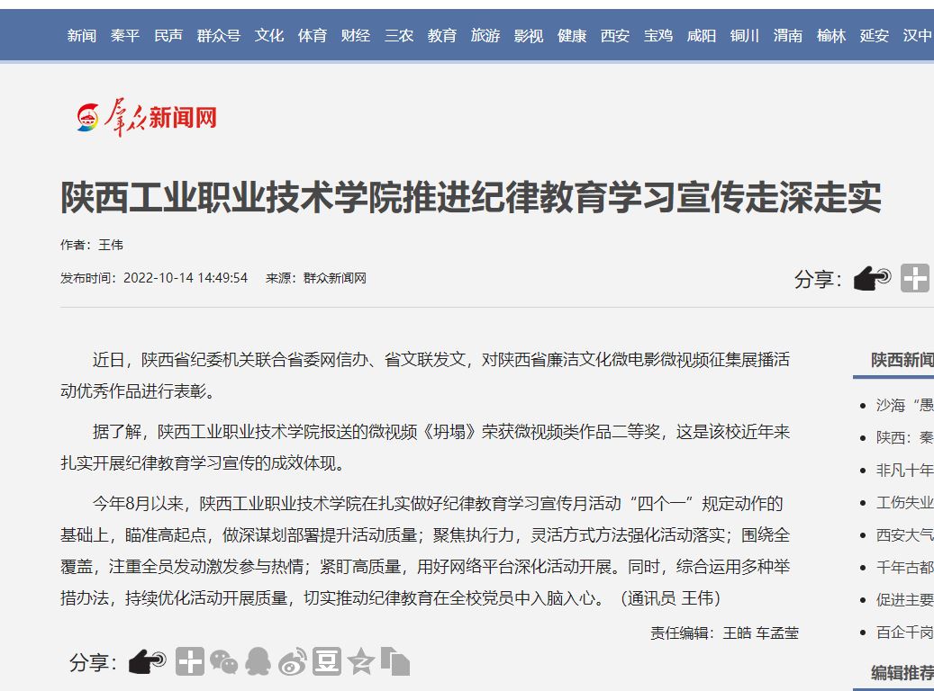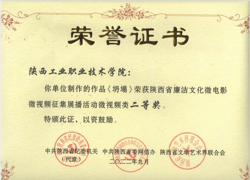 近日,陕西省纪委机关联合省委网信办、省文联发文,对陕西省廉洁文化微电影微视频征集展播活动优秀作品进行表彰,陕西工业职业技术学院报送的微视频《坍塌》荣获微视频类作品二等奖,作为全省高校系统报送的最好获奖等次作品,这是该校近年来扎实开展纪律教育学习宣传月活动的成效体现。