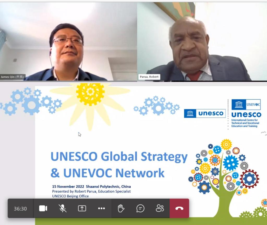 会上,国际教育学院李可老师从学校地理位置、办学历史和特色、发展目标、专业建设、国际合作等方面介绍了学校的基本情况。秦景俊院长感谢教科文组织驻华代表处对我校工作的关心和支持。在介绍了学校前期参与教科文组织相关职教项目和活动的情况后,他表示,陕西工院作为教科文组织在华年轻的职教联系中心,在今后的工作中,将加强与教科文组织驻华代表处紧密合作,推动和落实教科文组织相关职教政策和议程,落实好中国职教政策,加强与世界职教界的交流互鉴,为职业教育服务2030年可持续发展议程做出贡献。