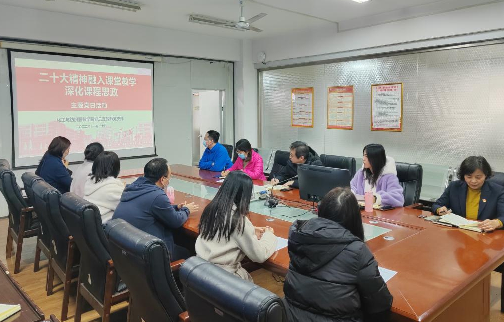 11月17日,化纺服学院教师党支部在崇文楼811会议室开展“党的二十大精神融入教学课堂 深化课程思政”主题党日活动,活动由教师支部书记刘迪主持,全体教师党员参会,会上就更好地把党的二十大精神融入专业课堂进行智慧碰撞。