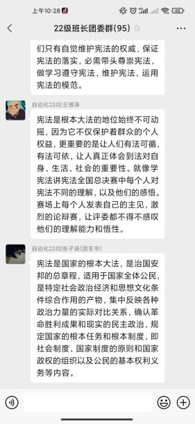 依托网络平台,营造学法氛围。为做好“12·4”宪法宣传周活动,利用班级QQ群、微信群开展“宪法学习心得”交流探讨会,学生结合自身的日常生活、学习等实际情况和现实情境,讲认识、谈体会,充分表现了自己对宪法的理解和情感。进一步丰富宣传形式、扩大宣传范围,增强学生法治观念,促进全校形成尊崇宪法、学习宪法、遵守宪法、维护宪法、运用宪法的良好风尚。