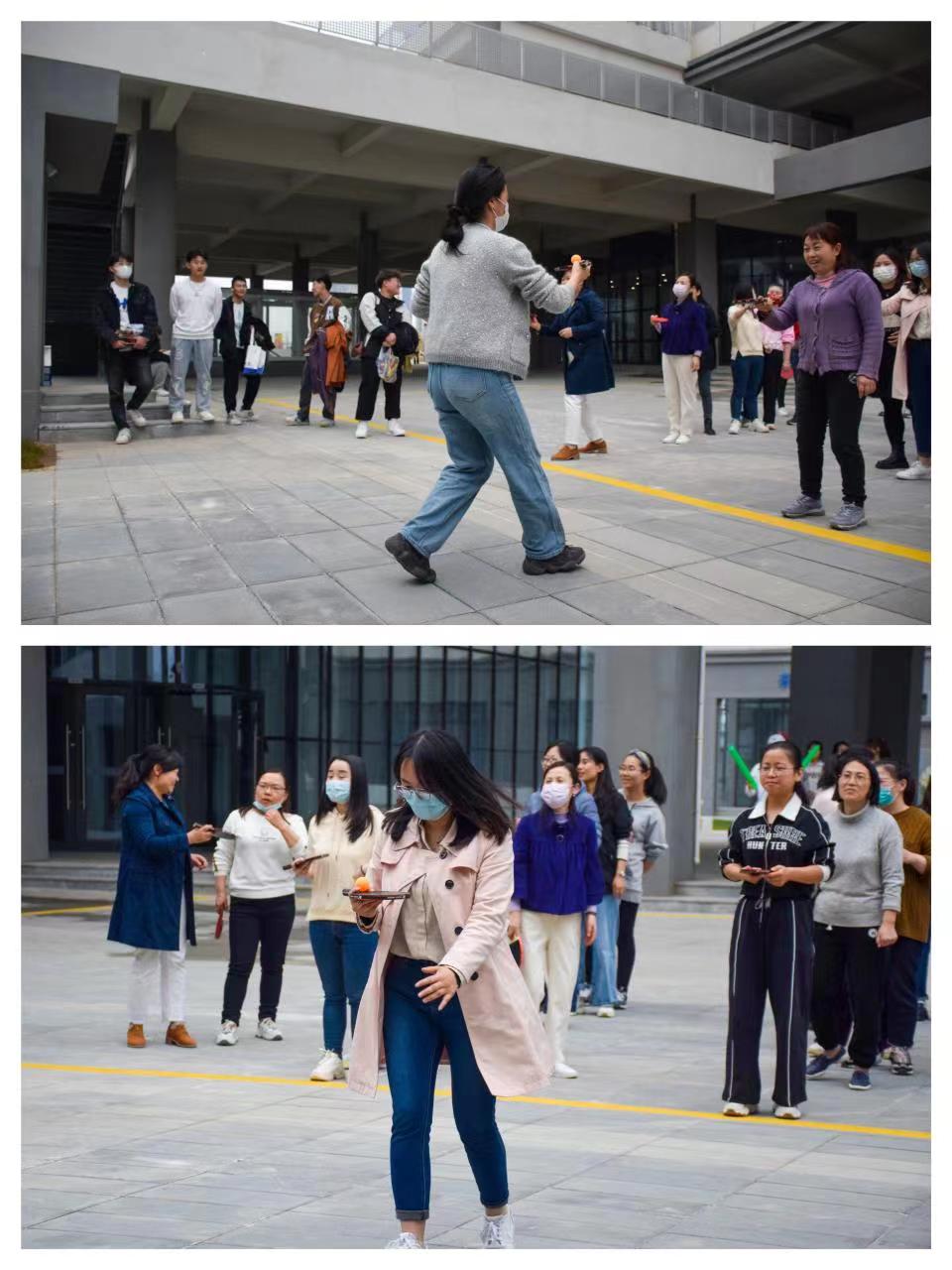 趣味活动在踢毽子比赛中拉开帷幕。比赛分为9组,每组4人,每组中每人比赛时间一分钟,在规定时间内踢毽子次数多者获胜,每组获胜者再组队进行一轮PK,最终评选出优胜者。比赛还未开始,已有不少女老师提前拿着毽子进行热身,场上人声沸鼎,热闹非凡。比赛中,大家呈现出动作连贯、速度快的特点,五颜六色的毽子此起彼伏,在大家的脚上开起了一朵朵鲜艳的花。乒乓球接力赛分为两组,队员将乒乓球托送到指定地点后返回传给下一个队员,最后一名队员先回到起点的队伍获胜。比赛场面欢快激烈,紧张有序,队员们相互鼓励,其乐融融,整个比赛充满了奋力拼搏的激情和欢乐,给初春的校园带来浓浓暖意,也让信息学院女教师度过了一个拼搏、团结、快乐、祥和的大课间。
