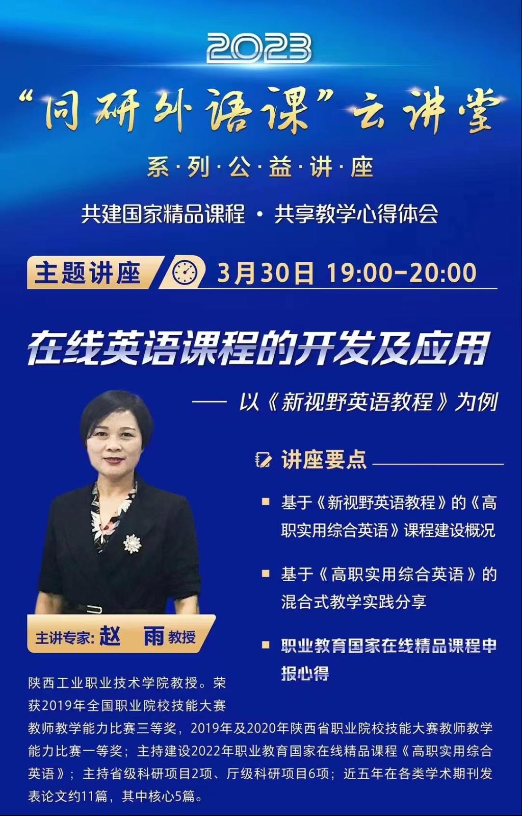 近日,受外研社特邀,我校公共课教学部赵雨老师在外研社全国U讲堂作了题为“在线英语课程开发及应用”云端专题学术报告,向来自全国各地的近3000名高职院校外语教师介绍了我校职业教育国家在线精品开放课程《高职实用综合英语》的建设经验及混合式教学案例,报告获得广泛好评,充分彰显了我校公共英语课程教师教学实力和课程建设能力。