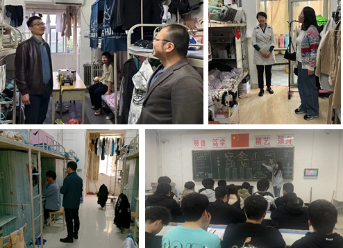 班会结束后,学院领导带队,辅导员和班主任走进学生宿舍,检查宿舍安全卫生情况,教育引导学生做好防火、防盗等宿舍安全防范,确保公寓安全稳定。