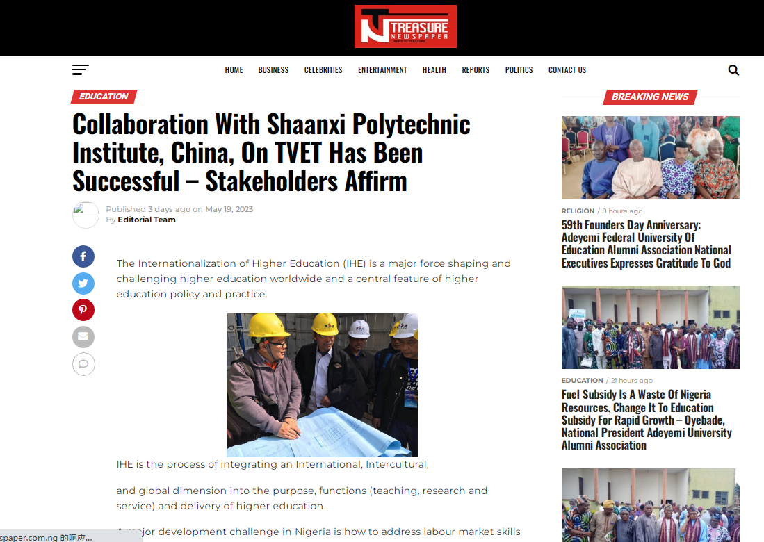 近日,尼日利亚财富新闻网等多家媒体,报道我校与该国职业教育机构开展的合作项目取得丰硕成果,称赞我校助力该国发展职业教育是中国“一带一路”的职教惠民工程。
