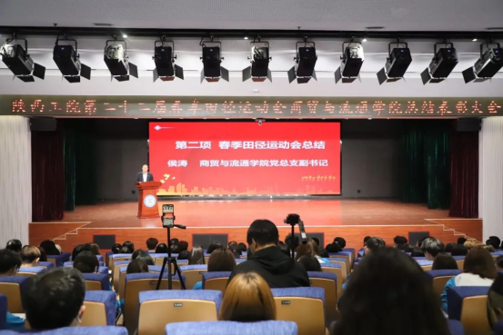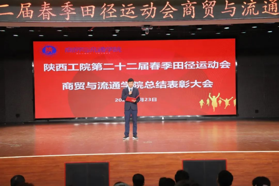 全体起立齐唱国歌后,党总支副书记侯涛作春季田径运动会总结表彰讲话。他指出:从今年3月底开始筹备,到今年4月13日、14日的激烈角逐,商贸与流通学院圆满完成了学校第二十二届春季田径运动会参赛组织、入场式、文体表演、志愿者服务等工作任务,取得了男子1500米、5000米双第一,男子跳远第一等多项突出成绩,文体表演获二等奖1项,三等奖1项,商贸与流通学院获体育道德风尚奖。回望筹备和比赛全程,商贸与流通学院全体辅导员与同学们一起汗流浃背,8位老师与同学们同袍登场,入场方阵81名同学迷彩亮相,26位退役复学同学热血对抗,340名同学“奋斗陕工院,拥抱大中国”,170名同学“青春圆舞曲,经开心飞扬”,还有47名近在咫尺却无法看到运动会开幕式的——负责入场幕板开合的志愿者,还有无数为了综合协调顶风冒雨、奋力奔跑的学生干部。正是因为有了他们的付出,商贸与流通学院才取得了一等奖3项、二等奖10项、三等奖20项的较好成绩,实现了比赛成绩和道德风尚双丰收,筹办工作中形成的宝贵经验,值得全院师生铭记并发扬光大。