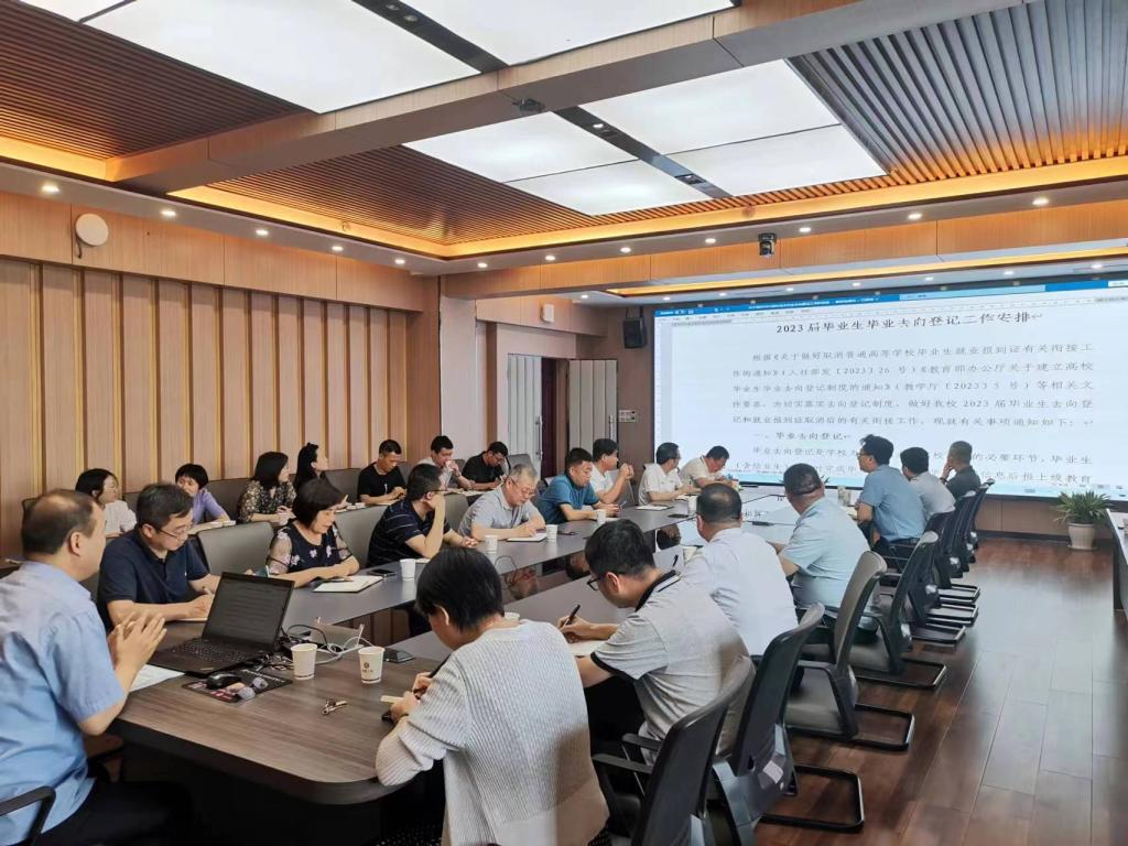 会上,就业指导处处长卢文澈传达了《教育部办公厅关于建立高校毕业生毕业去向登记制度的通知》精神,对毕业生毕业去向登记工作任务进行安排部署。