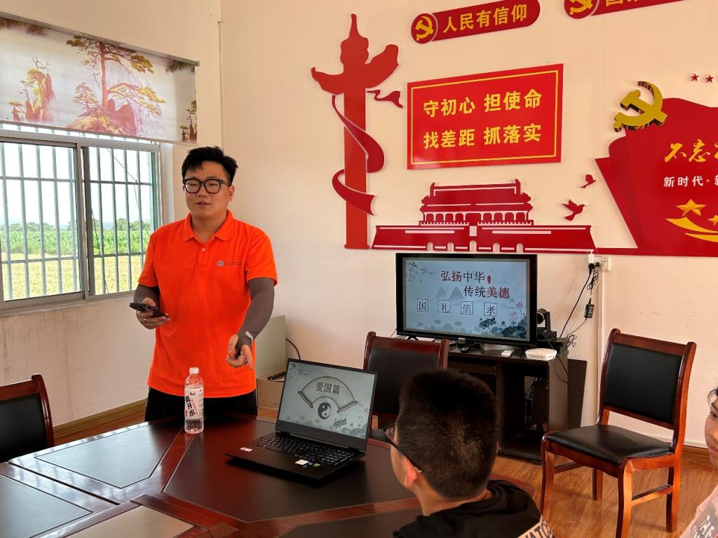 一、中华传统美德教育。实践团成员邢澳琪以“弘扬中华传统美德”为题,从“国”“礼”“信”“孝”四字入手,分别用英雄杨靖宇、三尺巷、曾子杀猪、亲尝汤药的故事,向孩子们传递爱国、明礼、诚信、孝道的价值观念,让孩子们感悟中华传统美德的独特魅力,养成良好的道德素质,并最终落实在行动上。