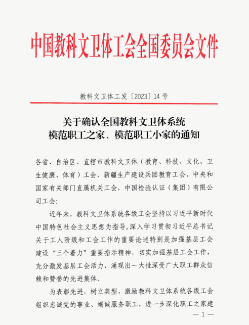近日,中国教科文卫体工会决定选树180个单位为全国教科文卫体系统模范职工之家,选树181个单位为全国教科文卫体系统模范职工小家。其中,航空工程学院分会荣获全国教科文卫体系统模范职工小家。
