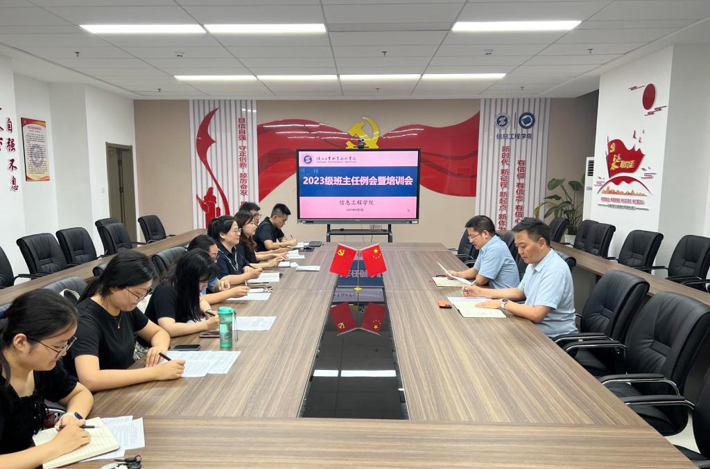 为强化2023级新生班主任队伍建设,提高学生管理水平,发挥教师对学生发展、成人成才的指导作用,9月5日晚,信息工程学院于崇理C801开展了2023级新生班主任例会暨培训会。党总支书记闫军、学工办主任穆昌及23级辅导员、班主任参加了会议。会议由学工办主任穆昌主持。