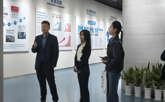 参观展厅,深入了解企业发展布局。在招聘管理部张振宇部长的陪同下,刘迪院长一行首先参观了华友钴业总部展厅。张振宇结合详实的图文数据,系统介绍了公司“根在中华、友遍天下”的发展历程与全球化布局。刘迪院长深入了解了企业在非洲资源产业、印尼镍产业、新材料、新能源及循环产业“五大事业板块”的战略蓝图,并认真听取了华友钴业依托印尼等海外项目参与共建“一带一路”的实践成果介绍。