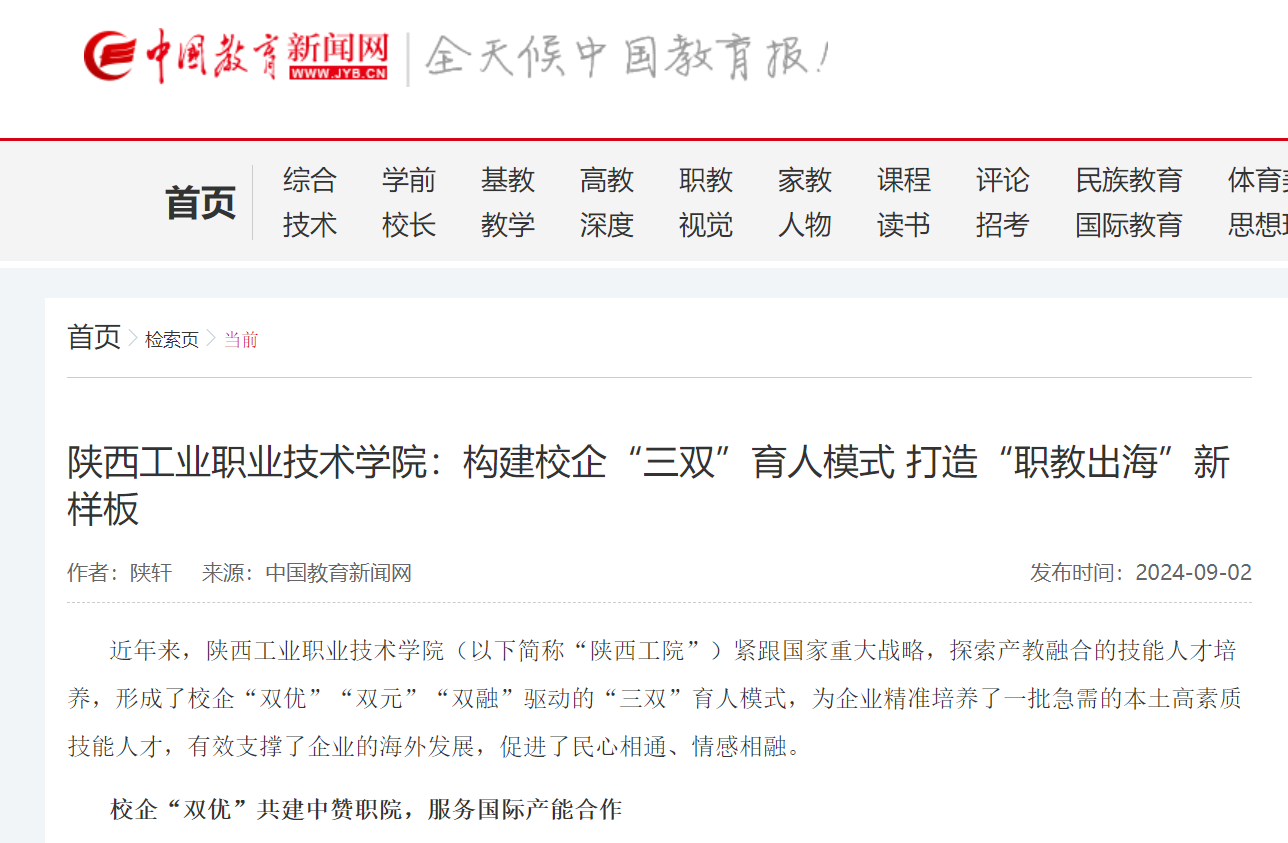 近年来,陕西工业职业技术学院(以下简称“陕西工院”)紧跟国家重大战略,探索产教融合的技能人才培养,形成了校企“双优”“双元”“双融”驱动的“三双”育人模式,为企业精准培养了一批急需的本土高素质技能人才,有效支撑了企业的海外发展,促进了民心相通、情感相融。