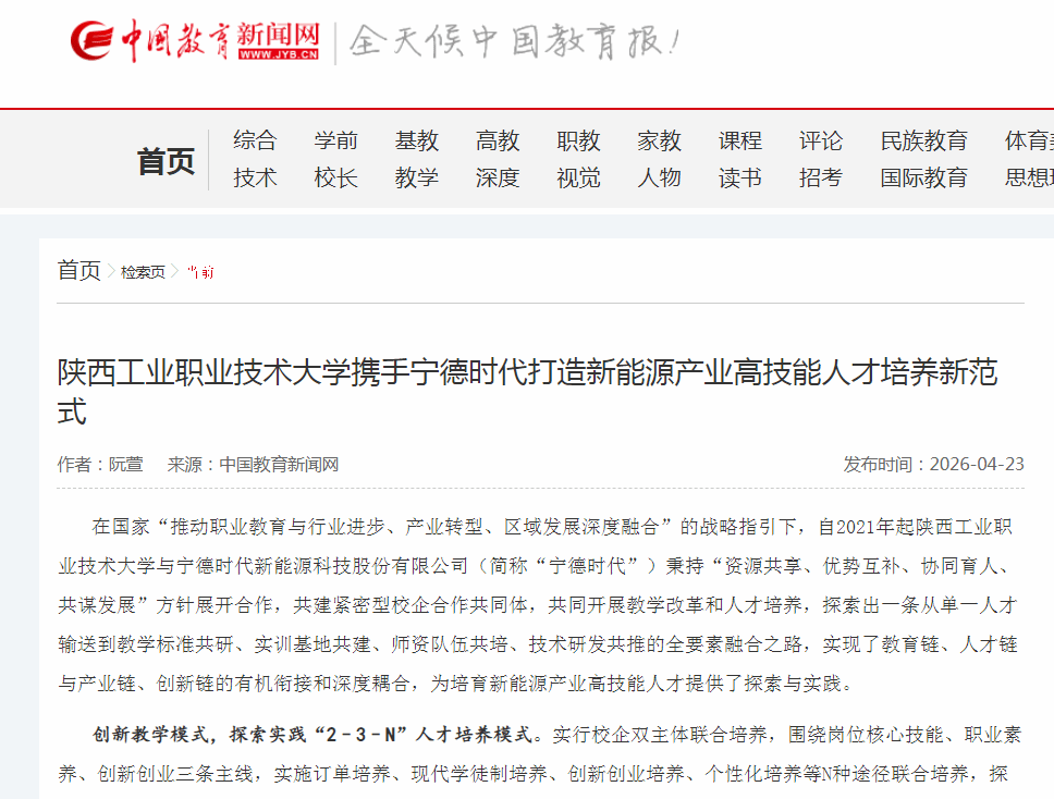 在国家“推动职业教育与行业进步、产业转型、区域发展深度融合”的战略指引下,自2021年起陕西工业职业技术大学与宁德时代新能源科技股份有限公司(简称“宁德时代”)秉持“资源共享、优势互补、协同育人、共谋发展”方针展开合作,共建紧密型校企合作共同体,共同开展教学改革和人才培养,探索出一条从单一人才输送到教学标准共研、实训基地共建、师资队伍共培、技术研发共推的全要素融合之路,实现了教育链、人才链与产业链、创新链的有机衔接和深度耦合,为培育新能源产业高技能人才提供了探索与实践。