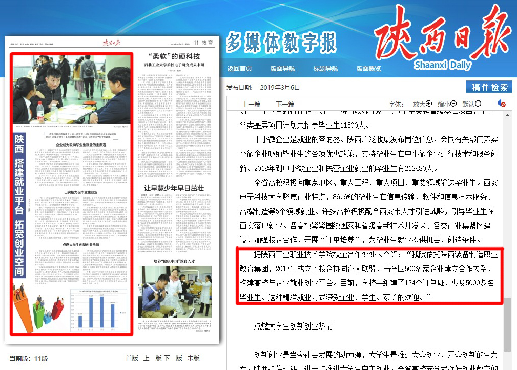 据陕西工业职业技术学院校企合作处处长介绍:“我院依托陕西装备制造职业教育集团,2017年成立了校企协同育人联盟,与全国500多家企业建立合作关系,构建高校与企业就业创业平台。目前,学校共组建了124个订单班,惠及5000多名毕业生。这种精准就业方式深受企业、学生、家长的欢迎。”