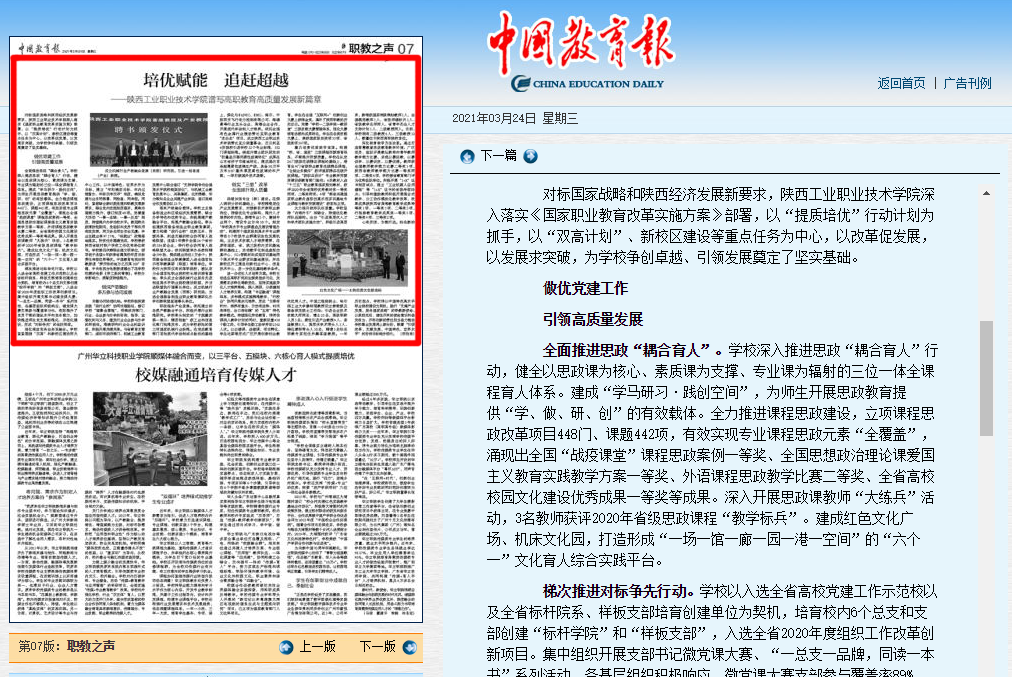 今日出版的《中国教育报》以《培优赋能、追赶超越——陕西工院谱写高职教育高质量发展新篇章》为题,聚焦我校推进中国特色高水平高职学院和专业群建设。原文如下:
