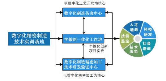 服务制造强国战略,聚焦数字化精密制造领域,对接陕西机床制造、航空制造、石油机械等支柱产业,以提高技术技能人才培养质量为核心,机械制造及自动化专业群携手中国机床行业的头部企业北京精雕科技集团有限公司共建先进制造精雕产业学院如图1所示。