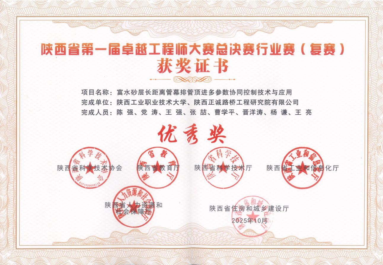陈强老师团队的“富水砂层长距离管幕排管顶进多参数协同控制技术与应用”项目,主要应用于城市建筑密集、地面交通繁忙等对地表沉降要求高、暗挖隧道超浅埋的隧道开挖施工场景,在软弱围岩及超大断面隧道进行超前支护的钢管顶进施工成套技术。通过自主研发基于水平衡原理的水位测量装置精准测量管幕钢管顶进偏差、改进传统顶进套管管口设计实现动态纠偏、融入BIM+的智能算法对隧道施工进行可视化模拟与状态感知三大技术,为解决管幕法在西北地区缺乏工程施工经验、施工难度大的工程难题作出贡献。