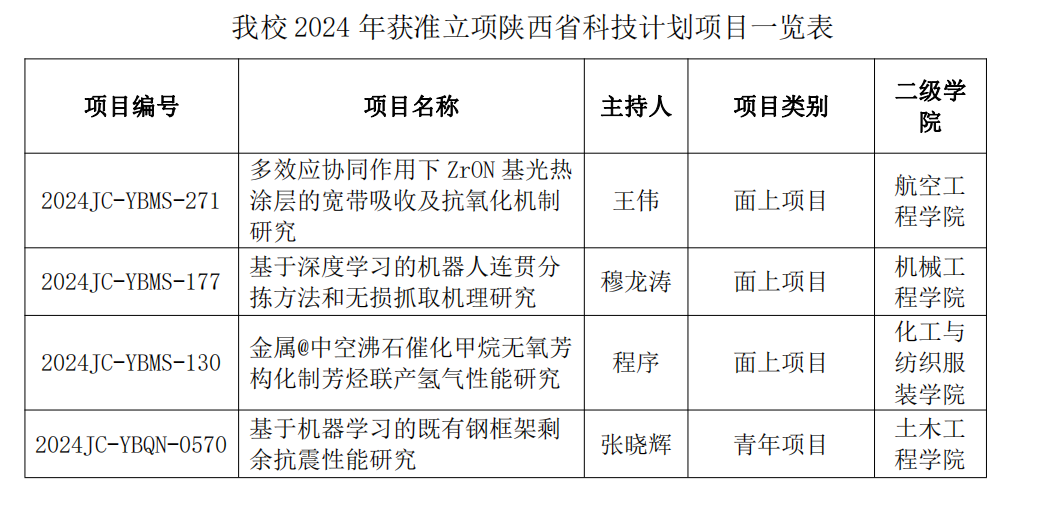 近日,据《陕西省科学技术厅关于下达2024年省级科技计划项目(第一批)经费的通知》(陕科发〔2024〕1号)获悉,我校2024年获批立项4项省级自然科学基础研究计划项目,其中青年项目1项、面上项目3项,共获资助科研经费20万元。