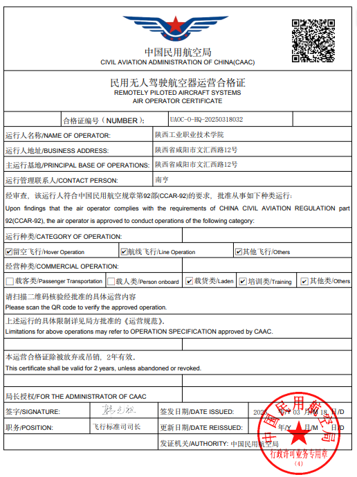 近日,我校正式获得由中国民用航空局(CAAC)颁发的民用无人驾驶航空器运营合格证(简称“运营合格证”)和民用无人机驾驶员训练机构合格证(简称“训练机构合格证”),成为咸阳市首家同时具备无人机运营与专业驾驶员培训资质的高职院校。