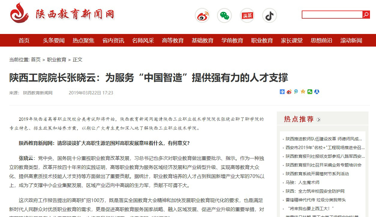 2019年陕西省高等职业院校分类考试即将开始,陕西教育新闻网邀请陕西工业职业技术学院院长张晓云聊了聊学院的专业特色、招生政策和培养方案,以期让广大考生更加深入地了解陕西工业职业技术学院。陕西教育新闻网:请您谈谈扩大高职生源范围对高职发展意味着什么,有何意义?张晓云:党中央、国务院十分重视职业教育改革...